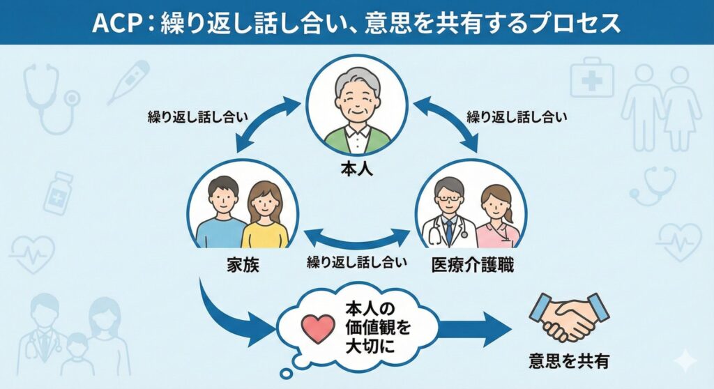 を本人・家族・医療介護職が話し合い、共有するプロセスです。