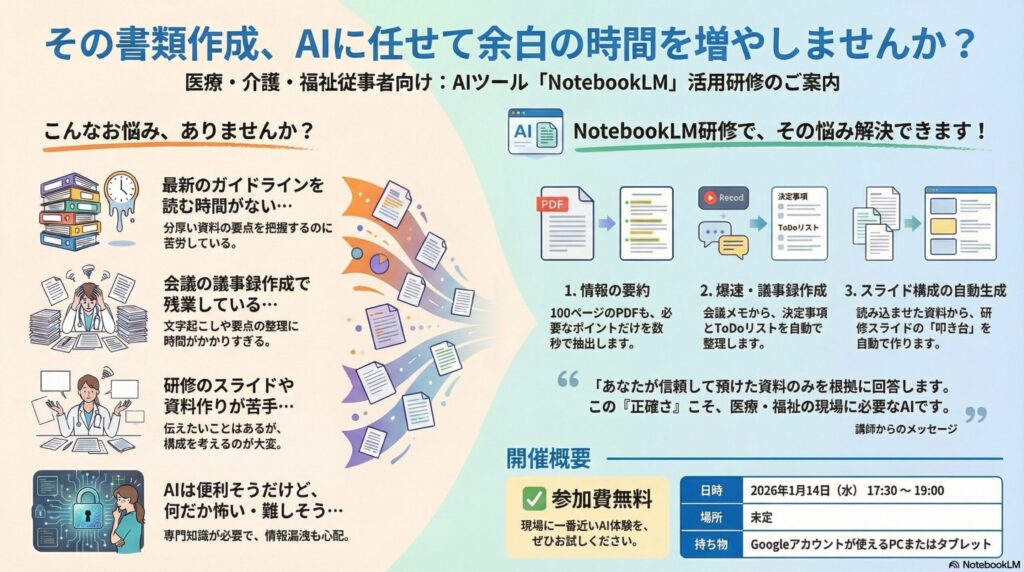 AIやデジタル技術の重要性が語られる機会は増えていますが、「知っている」ことと「現場で使える」ことの間には、まだ大きな隔たりがあります。特に福祉・医療・就労支援の現場では、日々の業務に追われる中で、新しいツールに触れるきっかけ自体が限られているのが現実です。